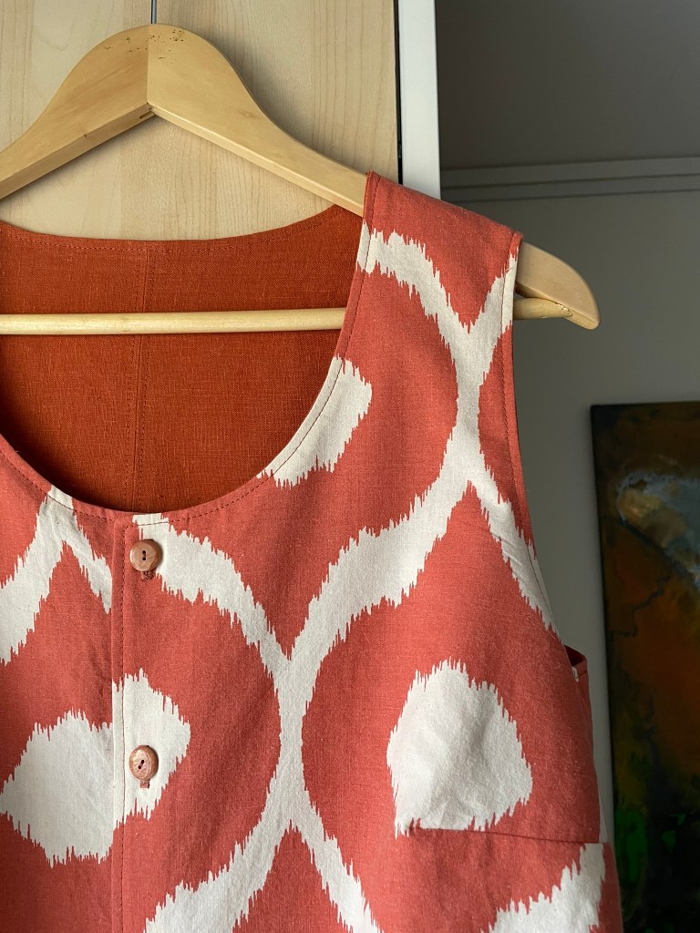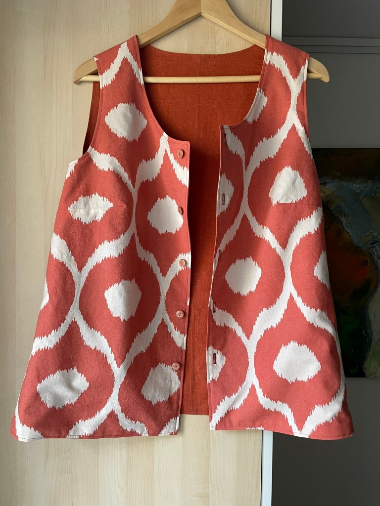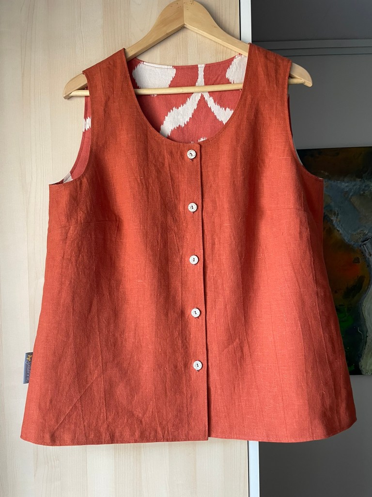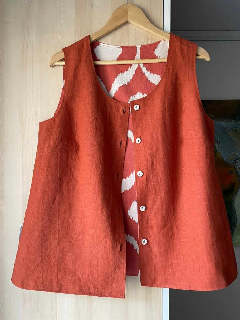 ENGLISH: An incredibly useful vest/blouse in lovely rust-orange linen on one side and comfortable cotton in a large-scale pattern in orange and off-white on the other side! The vest/blouse has buttons on both sides (see pictures below) and works both as a vest with, for example, a T-shirt underneath, or as a sleeveless blouse since it is not too low-cut. The armholes are also a nice size so that the blouse can be worn on its own on warm summer days.